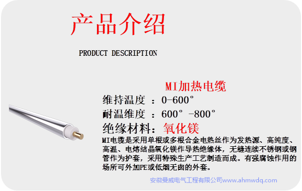 MI電纜是采用 單根或多根合金電熱絲作為發(fā)熱源、高純度、高溫、電熔結晶氧化鎂作導熱絕緣體,無縫連續(xù)不銹鋼或銅管作為護套,采用特殊生產(chǎn)工藝制造而成。有強腐蝕作用的場所可外加PE或低煙無鹵的外套。